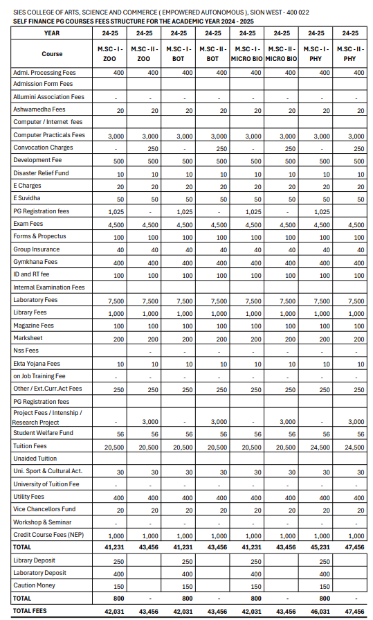 M.Sc Botany at SIES College of Arts Science and Commerce Mumbai is a 2 Years Degree. The course is offered On Campus as a Full Time program. SIES College of Arts Science and Commerce Mumbai M.Sc Botany Total Fees is INR 85,487 for 2024.