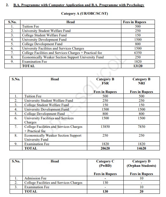 The annual fees for students have increased from 10,480 rupees in the first year to 11,870 rupees in the second year. This fee covers lab classes, practical sessions, theory classes, and online classes. DU SOL has a financial aid program for students from families with an annual income of less than 4 lakh rupees, providing a full fee refund. For those with family incomes between 4 lakh and 7 lakh rupees, about 50% of the fees are refunded.