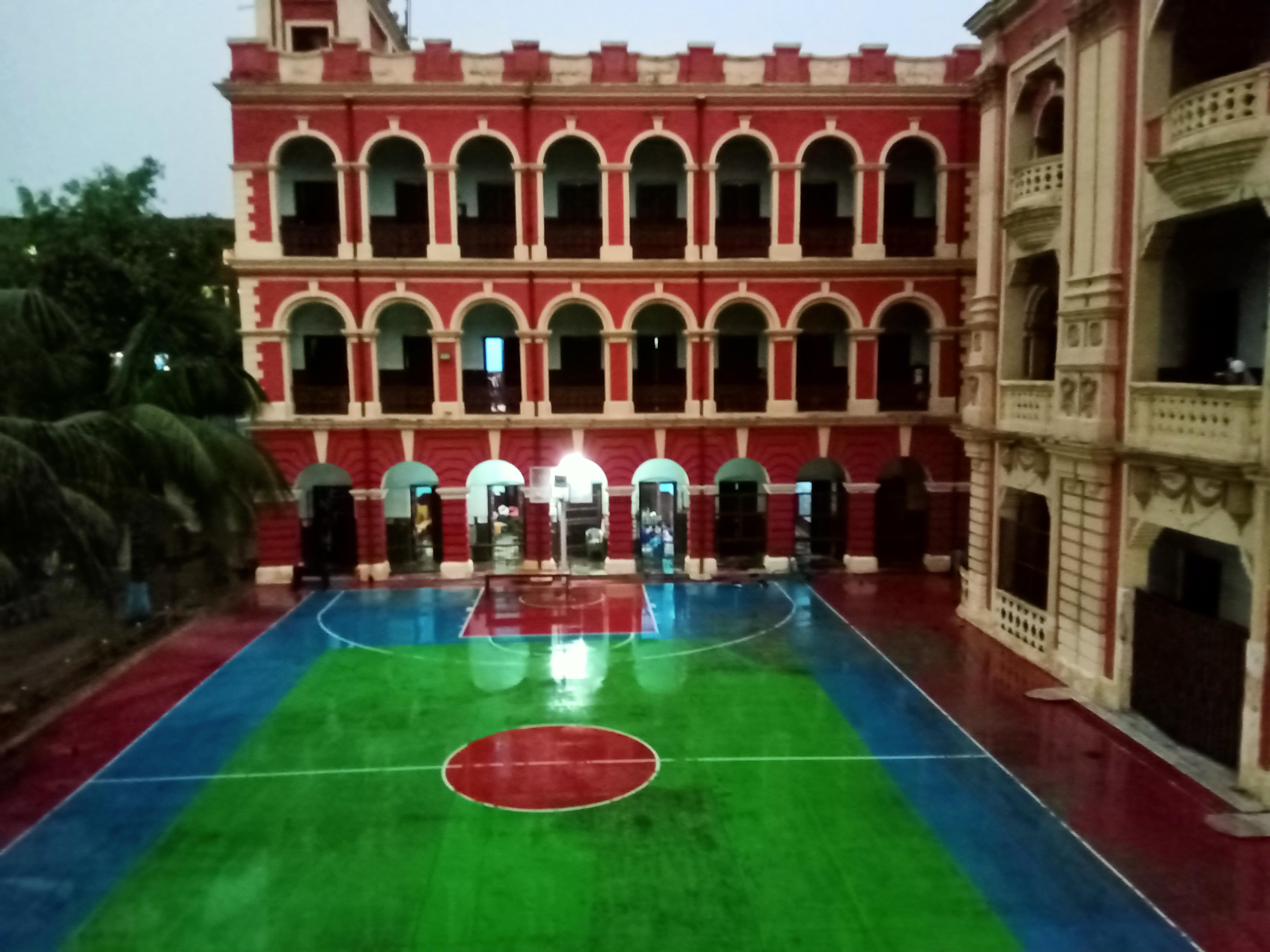 Sport- The vibrant sports courtyard of Seth Anandram Jaipuria College, Kolkata. The spacious playground is painted in bright green, blue, and red, designed for multiple sports activities. Surrounding the court is the historic college building with striking red-and-white architecture, elegant arches, and balconies. This blend of modern sports facilities with heritage architecture reflects the college’s commitment to academics and extracurricular excellence.