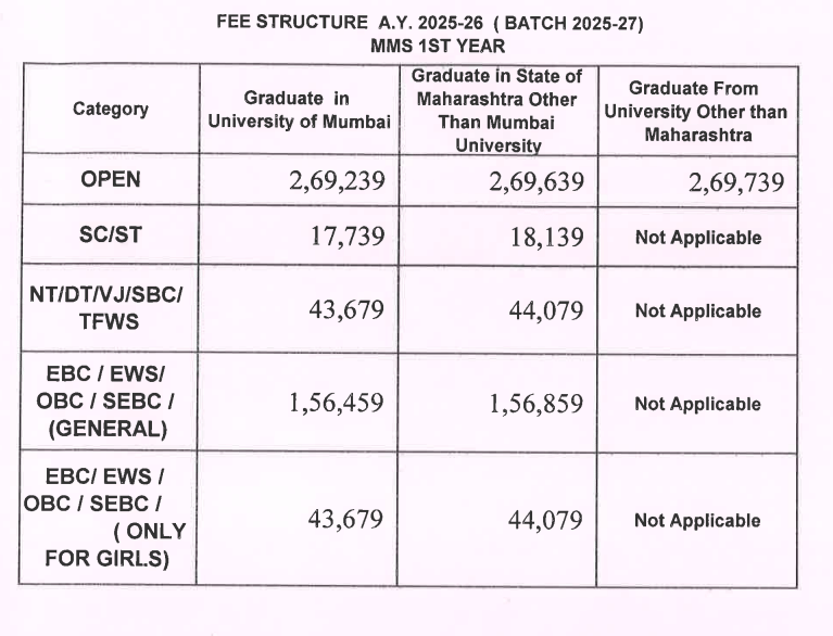 Chetana's Institute of Management and Research Mumbai M.M.S is offered as 2 Years Full Time program, with total intake of 120 seats. The minimum eligibility criteria for M.M.S is Graduation+MHA MBA CET. The total fees for Chetana's Institute of Management and Research Mumbai M.M.S in 2025 is ₹ 5.38 Lakhs for the complete course duration, which includes total tuition fees of ₹ 5.38 Lakhs.