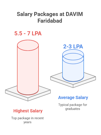 DAVIM Faridabad 2025 Placement data has been released in parts. The college does not release a list of students getting placed each year and the placement rate but according to the student reviews available on collegedunia and the limited DAVIM Faridabad placement data available online, the highest salary package in recent years was around INR 5.5 - 7 LPA and the average salary package ranged between INR 2-3 LPA. DAVIM Faridabad's top recruiters include BATA, IBM, HDFC Life, ICICI Bank, Tech Mahindra, TCS, Capgemini, etc.