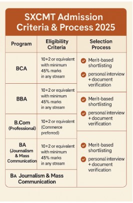 Admissions for the 2025-26 academic session at SXCMT are open for various UG programs, including BCA, BBA, BCP, BBA (IB), and BAJMC. Candidates must have passed Intermediate +2 or equivalent examination with a minimum of 50% marks (45% for SC/ST/Differently Abled applicants) to be eligible & students must have passed 10+2 or equivalent with at least 45% marks. Selection is based on merit in the qualifying examination, followed by a personal interview for select programs. Applicants can apply through the official college website or via the admission portal.