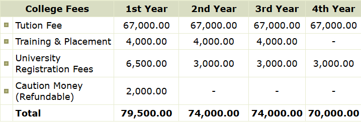 | Fees (2020 - 2021) | Year 1 (in INR) | Year 2 (in INR) | Year 3 (in INR) | Year 4 (in INR) |