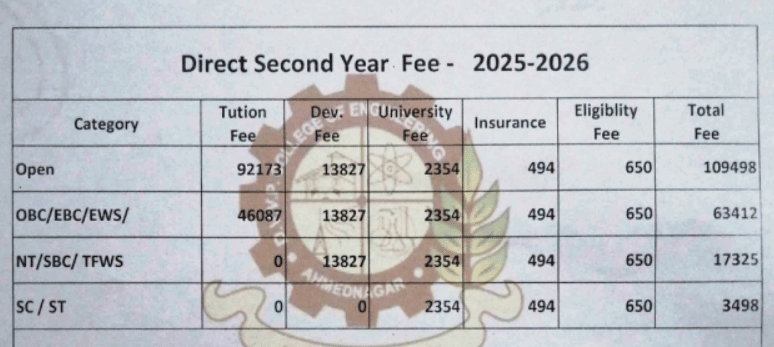 Dr. Vithalrao Vikhe Patil College of Engineering Ahmednagar BE {Lateral} Civil Engineering is offered as 3 Years Full Time program. The minimum eligibility criteria for BE {Lateral} is 10+2. The total fees for Dr. Vithalrao Vikhe Patil College of Engineering Ahmednagar BE {Lateral} Civil Engineering in 2025 is ₹ 3.28 Lakhs for the complete course duration, which includes total tuition fees of ₹ 2.77 Lakhs. Earlier, the fees in 2024 - 2025 for BE {Lateral} Civil Engineering was ₹ 3.18 Lakhs.