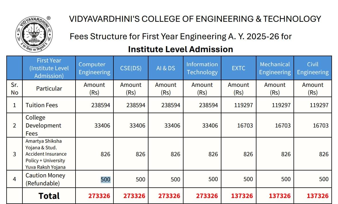 Vidyavardhini's College of Engineering and Technology Palghar BE Civil Engineering is offered as 4 Years Full Time program, with total intake of 60 seats. The minimum eligibility criteria for BE is (10+2) + JEE MAIN. The total fees for Vidyavardhini's College of Engineering and Technology Palghar BE Civil Engineering in 2025 is ₹ 5.12 Lakhs for the complete course duration, which includes total tuition fees of ₹ 4.34 Lakhs. Earlier, the fees in 2022 - 2023 for BE Civil Engineering was ₹ 4.88 Lakhs.