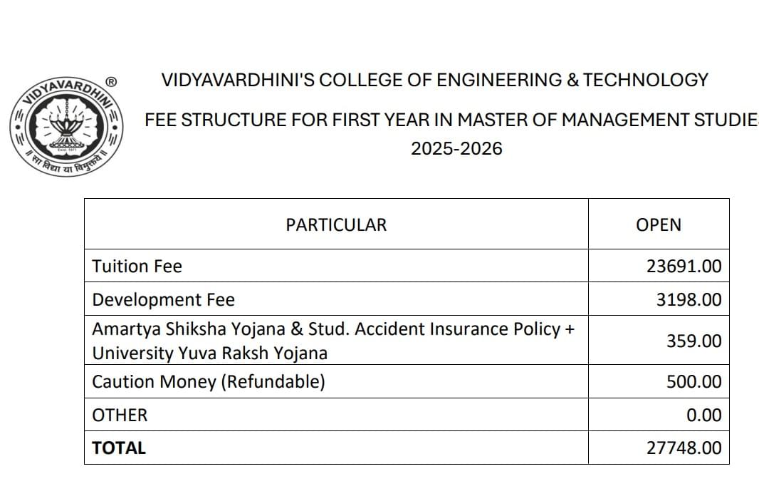 Vidyavardhini's College of Engineering and Technology Palghar M.M.S is offered as 2 Years Full Time program. The minimum eligibility criteria for M.M.S is Graduation + CET. The total fees for Vidyavardhini's College of Engineering and Technology Palghar M.M.S in 2025 is ₹ 2.01 Lakhs for the complete course duration, which includes total tuition fees of ₹ 1.73 Lakhs.