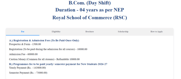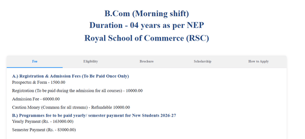 Earlier, B.Com (H) Research fees at Royal School of Commerce Guwahati was ₹ 5.7 Lakhs (in 2025) for the entire course duration. This shows a fee increase of ₹ 83,500 over the year.