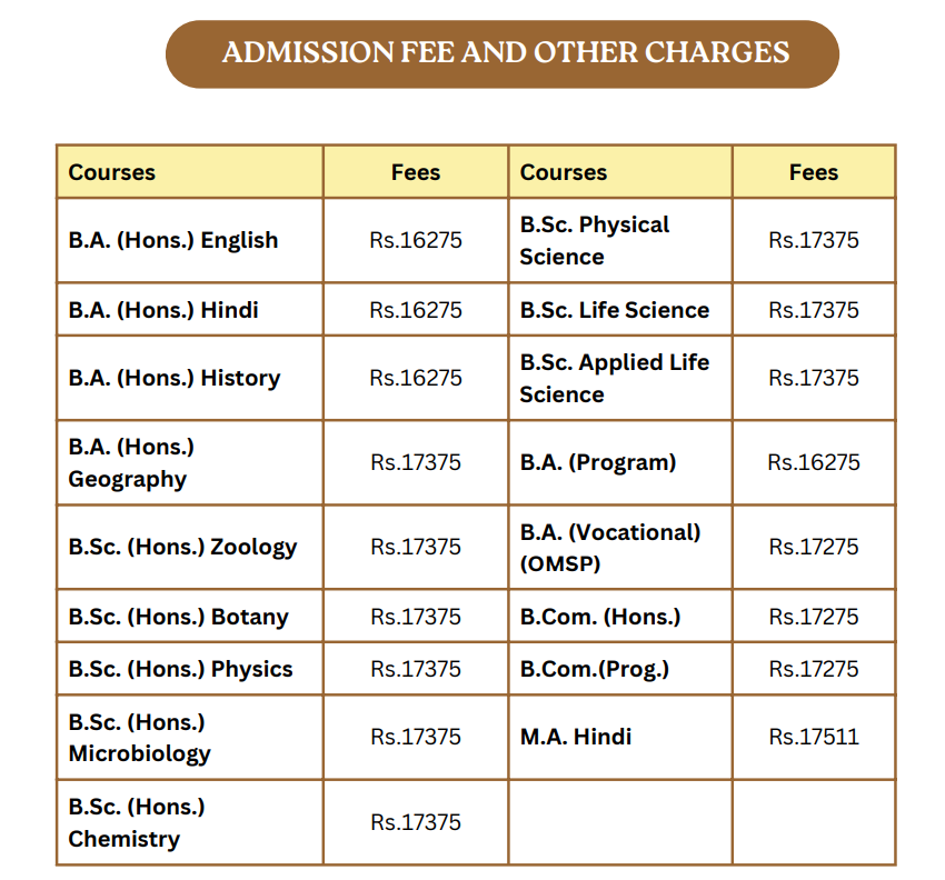 The college hosts an annual job and internship fair, though some students feel placement opportunities are insufficient, prompting them to pursue further studies or government exams. Scholarships include sports, academic, and special scholarships for lower caste students, managed by DU, with fee refunds available for SC/ST students. The annual fee ranges from Rs. 12,000 to Rs. 15,000, with additional exam fees, ensuring affordability for most. Scholarships and internships are also available to students with a family income below 8 lakh per annum.