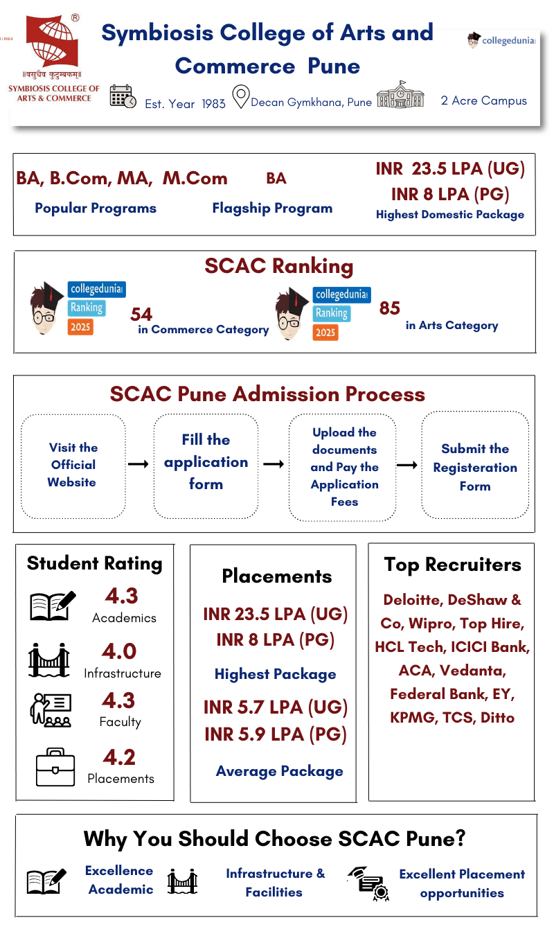 Symbiosis College of Arts and Commerce, also known as SCAC, is a private autonomous college established in 1983 in Deccan Gymkhana, Pune. The college is affiliated with Savitribai Phule Pune University. The college is recognised by UGC. NAAC has awarded the college an A+ Grade. SCAC ranking by CollegeDunia is 54 out of 321 for Commerce, and it is 86 out of 259 for Arts among colleges in India in 2025.
