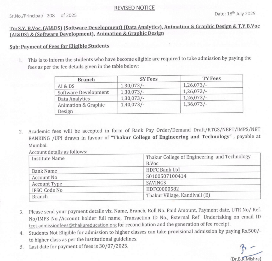 Earlier, B.Voc Data Science fees at TCET Mumbai was ₹ 3.93 Lakhs (in 2023) for the entire course duration. This shows a fee decrease of ₹ 7,009 over the year.