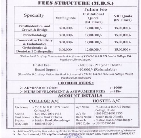 Shri Yashwantrao Chavan Memorial Medical & Rural Development Foundation's Dental College Ahmednagar MDS Orthodontics fees in first year is ₹ 3.01 Lakhs. The detailed fees is mentioned below.Shri Yashwantrao Chavan Memorial Medical & Rural Development Foundation's Dental College Ahmednagar Hostel Fee is ₹ 1.6 Lakhs.