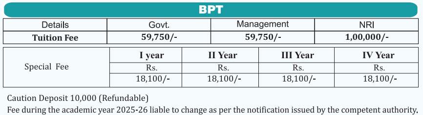 EMS College of Paramedical Sciences Malappuram B.P.T fees in first year is ₹ 77,850. The detailed fees is mentioned below.EMS College of Paramedical Sciences Malappuram Hostel Fee is ₹ 26,000 to 50,000.