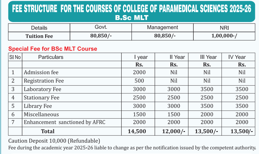 EMS College of Paramedical Sciences Malappuram B.Sc Medical Laboratory Technology fees in first year is ₹ 95,350. The detailed fees is mentioned below.EMS College of Paramedical Sciences Malappuram Hostel Fee is ₹ 26,000 to 50,000.