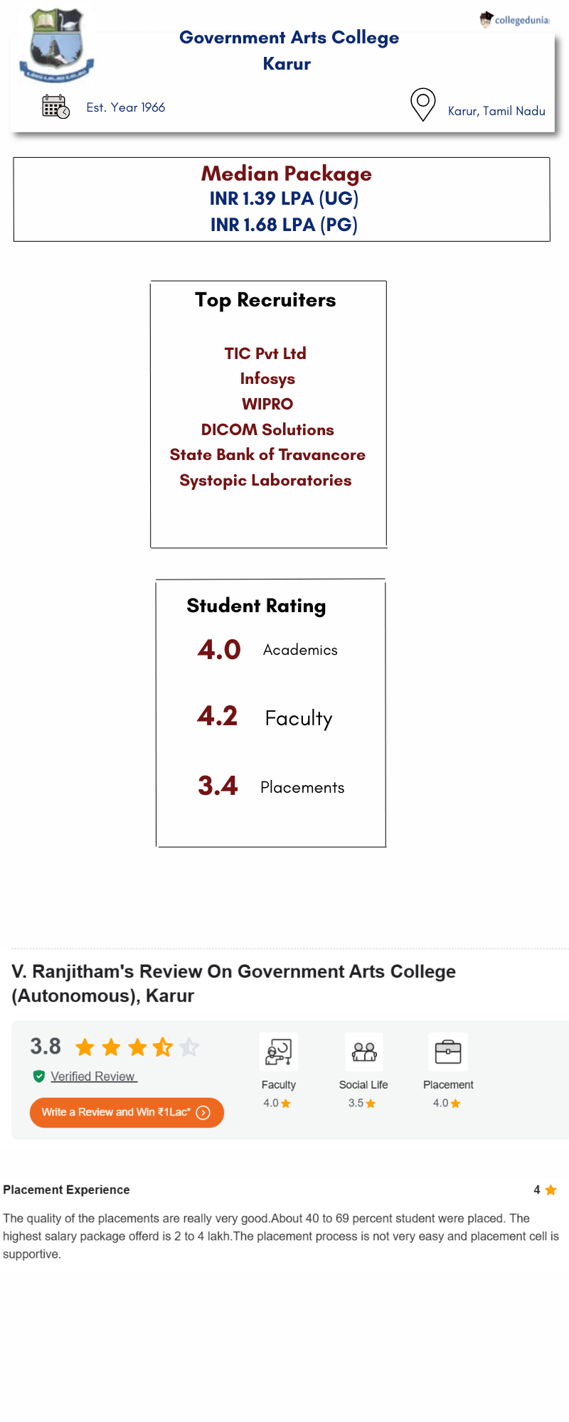 Ans. Placements at Government Arts College, Karur, are consistently solid for a government institution. The placement cell puts genuine effort into guiding students, arranging pre-placement training, and inviting reputable recruiters each year. Students get opportunities with IT giants, banks, and major companies in the region. The median salary for UG and PG students is competitive with the best government arts colleges in Tamil Nadu, and many alumni have gone on to successful careers in the private and government sectors. Even so, a sizeable group chooses higher studies, which underlines the college’s academic orientation and support for lifelong learning.