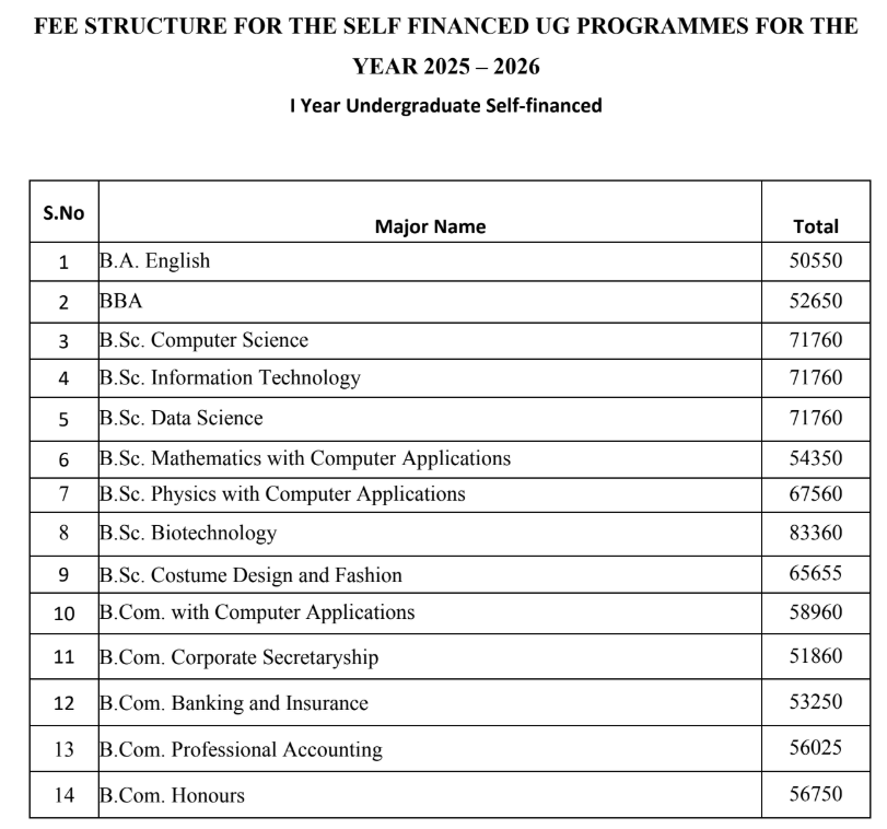 Earlier, BA English fees at Lady Doak College Madurai was ₹ 22,329 (in 2024) for the entire course duration. This shows a fee increase of ₹ 50,658 over the year.