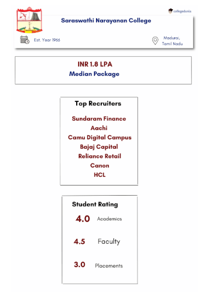 Saraswathi Narayanan College Median package is INR 1.8 LPA, with the recruiters including Annapurna Finance Pvt Ltd, Foxconn Pvt Ltd, Aquasub Engineering, etc.