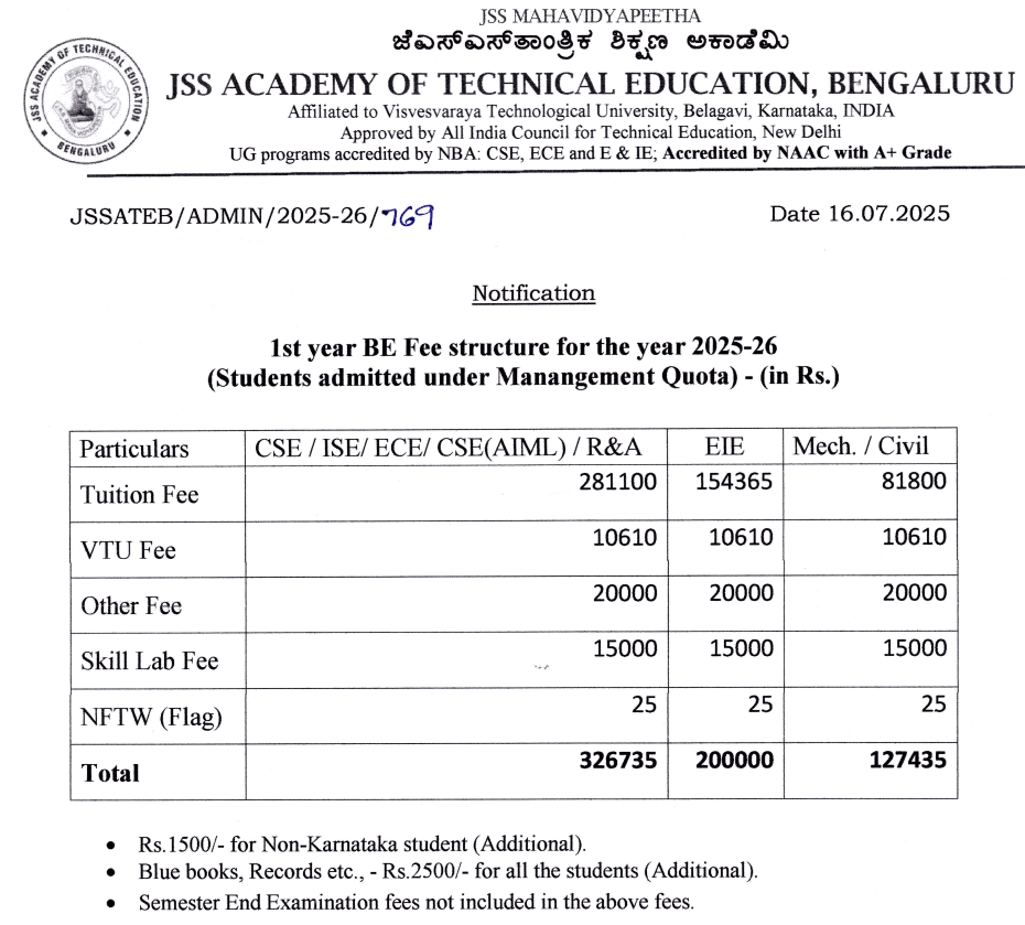 JSS Academy Bangalore BE Robotics and Automation Previous Fees