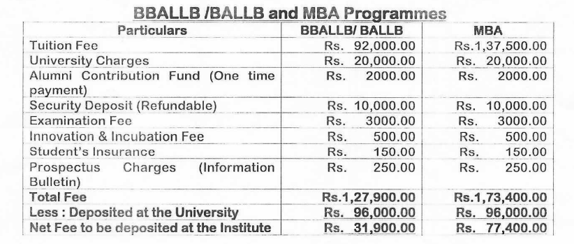 The curriculum highlights internships, especially for law students, who must complete internships from their 3rd year, with the final semester dedicated to this experience. Students primarily arrange internships themselves, with limited attendance credit for internships before the 5th year. The first-year fee is approximately 1,10,000 INR, while hostel accommodations cost 63,000 INR for 10 months, decreasing to 53,000 INR from the second year. A 10,000 INR security deposit is also required.