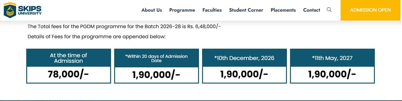 Earlier, PGDM Applied Finance fees at SKIPS School of Business was ₹ 12.51 Lakhs (in 2025) for the entire course duration. This shows a fee decrease of ₹ 6.03 Lakhs over the year.