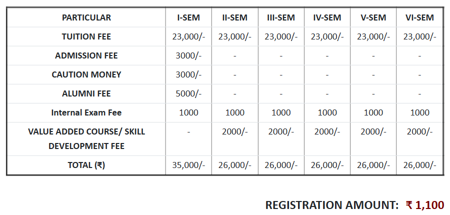 B.Tech Mechanical ranges from Rs 80,000 to Rs 1,00,000 annually. MBA and PGDM courses, however, have higher fees ranging from Rs 45,000 to Rs 65,000 annually. Placement opportunities are gradually improving, especially for MBA and PGDM students, with packages around Rs 6.8 lakhs per annum. Undergraduate placements offer packages between Rs 1.8 to Rs 2.2 lakhs. Companies like Mother Dairy, Godrej, Axis Bank, Bajaj, Vivo, Samsung, and Cognizant participate in campus placements. Students are placement-eligible from the 4th semester, with internships available at firms like Tanishq and Tata Motors.