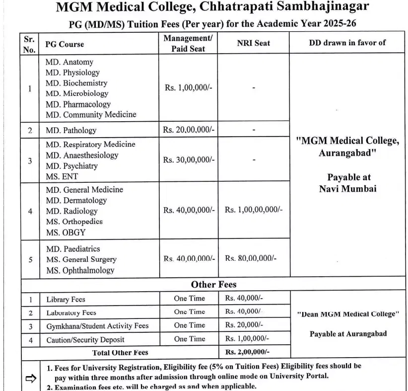 10 Oct, 2025 Mahatma Gandhi Mission's Medical College Aurangabad Fee Structure 2025-26 has been released for various M.S General Surgery courses. The total academic fee is ₹ 1.22 Crore.