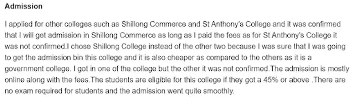 Candidates must achieve a minimum of 50% in their board examinations to be considered for enrollment. There is no explicit mention of direct or management quota admissions, focusing primarily on merit-based selection. The college's competitive fee structure is a notable factor for prospective students, with comparisons often drawn against other institutions like St. Anthony’s College. Overall, while the process favors candidates based on academic performance, the focus remains on facilitating access through an efficient online application procedure.