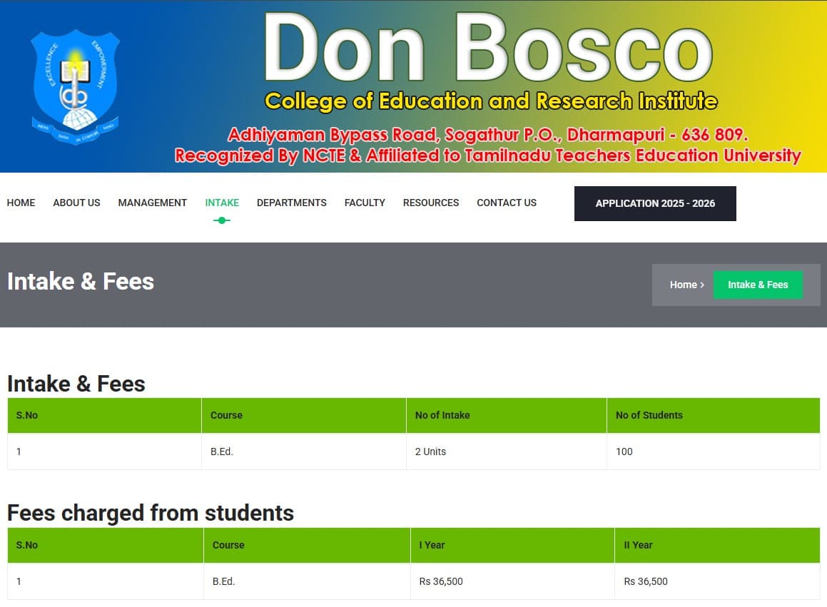 Earlier, B.Ed fees at Don Bosco College of Education and Research Institute Dharmapuri was ₹ 70,000 (in 2019) for the entire course duration. This shows a fee increase of ₹ 3,000 over the year.