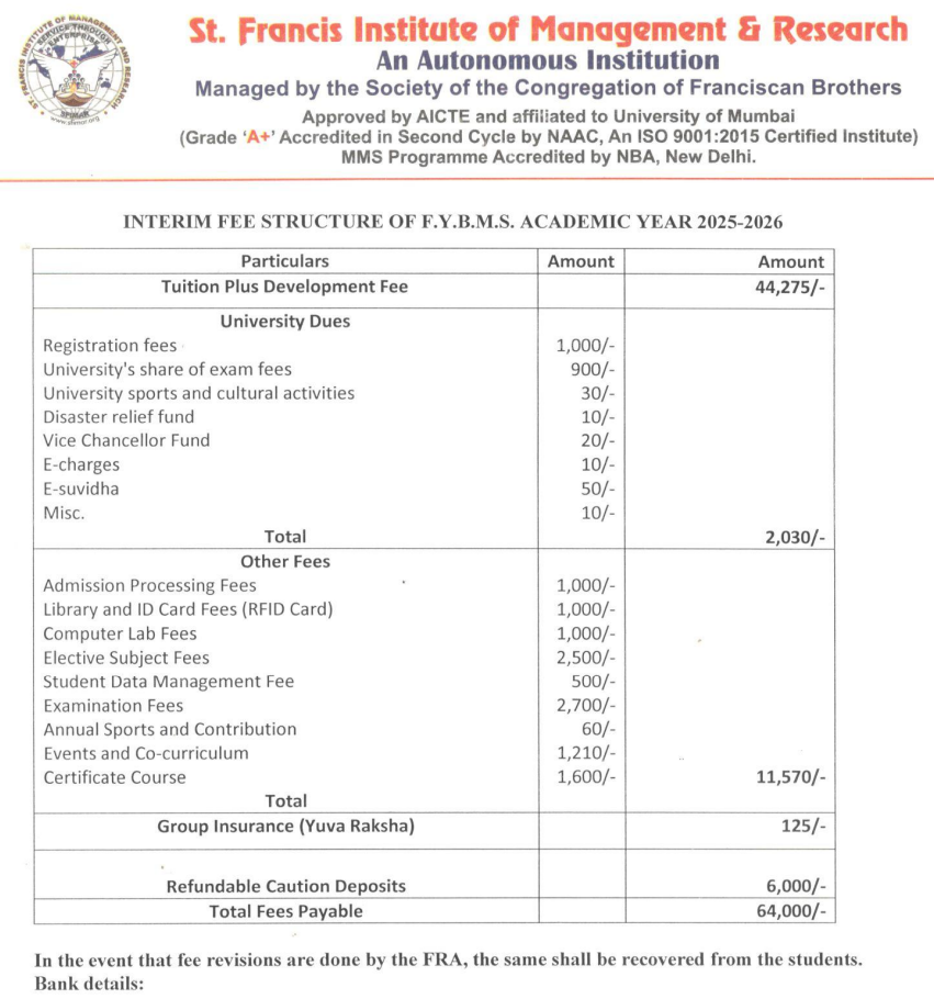 BMS at St. Francis Institute of Management and Research Mumbai is a 4 Years Degree. The course is offered On Campus as a Full Time program. St. Francis Institute of Management and Research Mumbai BMS First Year Fees is INR 64,000 for 2025.