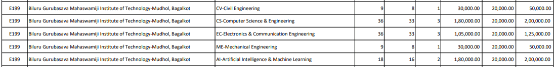Biluru Gurubasava Mahaswamiji Institute of Technology Bagalkot KCET Cutoff 2025 rank is 186466 for the 2AG category. Further, the cutoff rank is 169261 for 2BG category, 159979 for GM category, Earlier, the KCET cutoff rank 2024 was 213159 for the 2AG category.