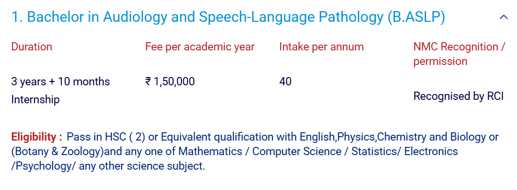 SRMC Chennai BASLP Audiology And Speech [Language Pathology] is offered as 3 Years Full Time program, with total intake of 40 seats. The minimum eligibility criteria for BASLP is 10+2. The total fees for SRMC Chennai BASLP Audiology And Speech [Language Pathology] in 2025 is ₹ 4.5 Lakhs for the complete course duration, which includes total tuition fees of ₹ 4.5 Lakhs. Earlier, the fees in 2021 - 2022 for BASLP Audiology And Speech [Language Pathology] was ₹ 4.5 Lakhs.