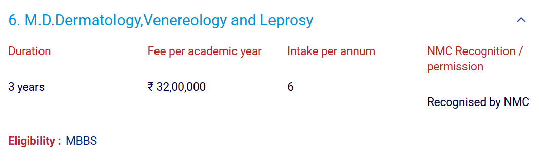 The minimum eligibility for admission to M.D Dermatology, Venereology & Leprology at SRMC Chennai is MBBS. Candidates are allotted seats based on NEET-PG.