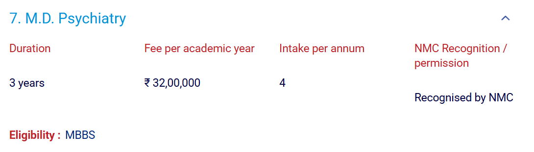 The minimum eligibility for admission to M.D Psychiatry at SRMC Chennai is MBBS. Candidates are allotted seats based on NEET-PG.