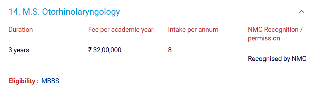SRMC Chennai M.S Otorhinolaryngology is offered as 3 Years Full Time program, with total intake of 8 seats. The minimum eligibility criteria for M.S is MBBS. The total fees for SRMC Chennai M.S Otorhinolaryngology in 2025 is ₹ 96 Lakhs for the complete course duration, which includes total tuition fees of ₹ 96 Lakhs. Earlier, the fees in 2024 - 2025 for M.S Otorhinolaryngology was ₹ 81 Lakhs.