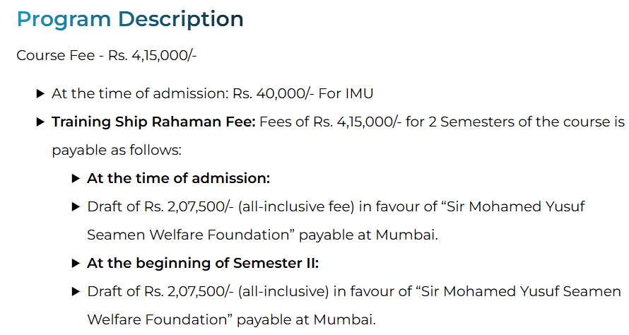 The program fees are substantial, with the one-year course at Rs. 3.5 lakhs and the diploma at Rs. 3.6 lakhs for two semesters. The college provides significant placement opportunities, with 70-80% placement rates. Reputed companies like Fleet Management and MSC recruit graduates, and students can earn stipends during training periods. Financial aid, including scholarships for top entrance exam rankers, reduces fees significantly. Overall, the college offers comprehensive academic and placement support, ensuring students are well-prepared for maritime careers.