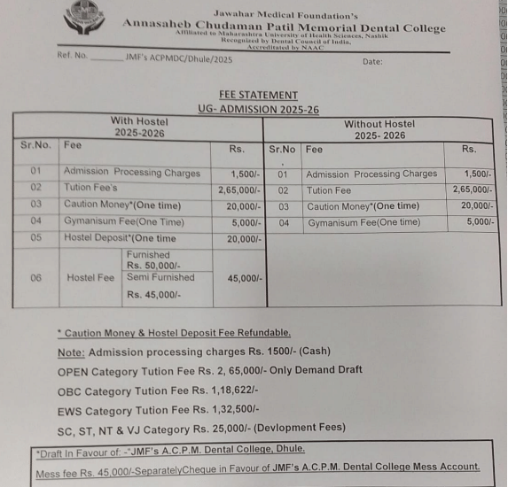 The five-year program, including a one-year internship, prepares them for roles in the medical industry or starting their own clinics. The college provides exposure to a high patient influx and offers placement training and skill development programs. Students can intern at the nearby A.C.P.M. Dental Hospital, gaining practical experience, despite no stipend being provided. The basic annual fee is about Rs 241,000, but financial aid is available through government scholarships and education loans, with potential fee variations based on reservation categories.