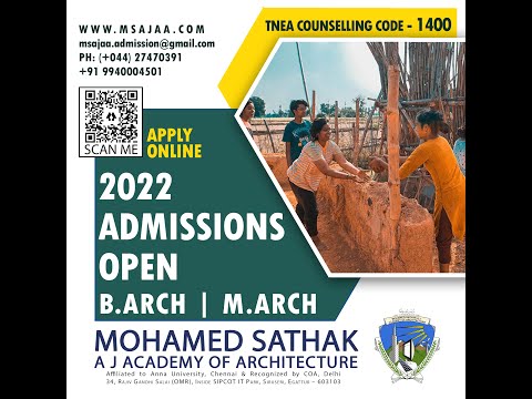 Mohamed Sathak AJ Academy of Architecture, established in 2010 is a private institute which is affiliated to Anna University, Chennai and approved by COA. Admission to various courses are currently ongoing. MSAJAA is located in the IT corridor inside the SIPCOT premises, thereby being well connected to the city. MSAJAA offers B.Arch at the undergraduate level and M.Arch at the postgraduate level. Admission to the courses offered are done based on the valid scores in NATA.