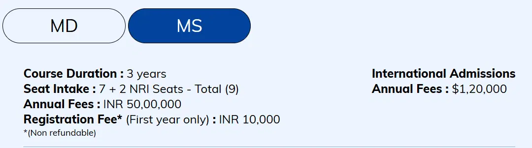 SRM Medical College Hospital and Research Centre Kanchipuram M.S Obstetrics & Gynaecology is offered as 3 Years Full Time program, with total intake of 9 seats. The minimum eligibility criteria for M.S is MBBS+ NEET PG. The total fees for SRM Medical College Hospital and Research Centre Kanchipuram M.S Obstetrics & Gynaecology in 2025 is ₹ 1.5 Crore for the complete course duration, which includes total tuition fees of ₹ 1.5 Crore. Earlier, the fees in 2024 - 2025 for M.S Obstetrics & Gynaecology was ₹ 1.35 Crore.