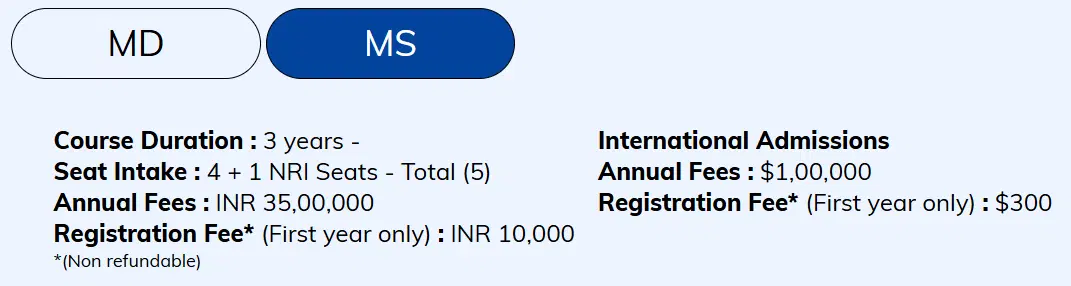 SRM Medical College Hospital and Research Centre Kanchipuram M.S Opthalmology is offered as 3 Years Full Time program, with total intake of 5 seats. The minimum eligibility criteria for M.S is MBBS+ NEET PG. The total fees for SRM Medical College Hospital and Research Centre Kanchipuram M.S Opthalmology in 2025 is ₹ 1.05 Crore for the complete course duration, which includes total tuition fees of ₹ 1.05 Crore. Earlier, the fees in 2021 - 2022 for M.S Opthalmology was ₹ 90 Lakhs.