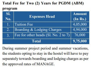 Earlier, PGDM Agri-Business Management fees at MANAGE Hyderabad was ₹ 9 Lakhs (in 2025) for the entire course duration. This shows a fee increase of ₹ 75,000 over the year.