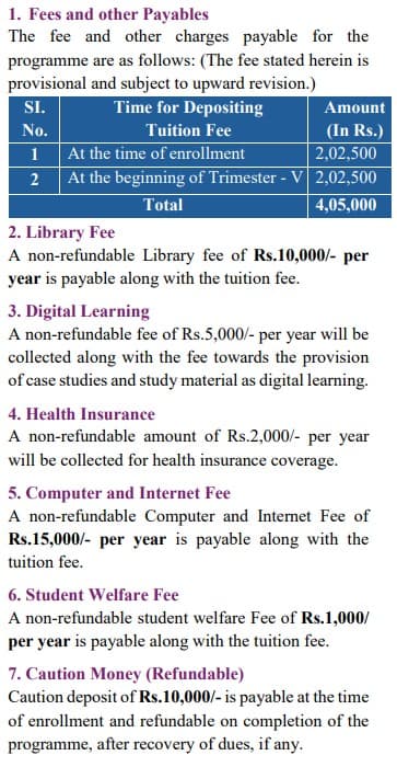 The program requires mandatory summer placements in the first year, with stipends ranging from Rs 20,000 to Rs 80,000. Scholarships are available for students with annual incomes below Rs 100,000, alongside other merit-based scholarships. The program is a full-time residential course with a current fee of Rs 8,50,000, and the tuition fee per year is Rs 2,02,500. Overall, the course offers a comprehensive education with strong placement support and is considered affordable compared to other institutions.