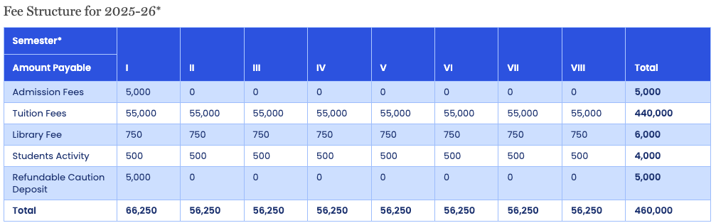 | Semester Wise Fees | ₹66250 | ₹56250 | ₹56250 | ₹56250 | ₹56250 | ₹56250 | ₹56250 | ₹56250 |