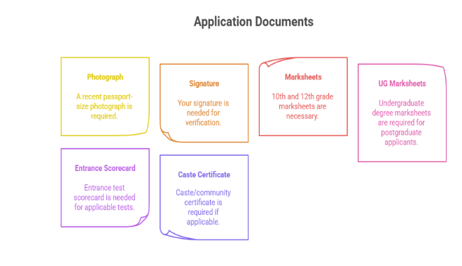 Ans. The following documents are required for admission: the mark sheets of 10th, 12th, graduation, ID proof, entrance scorecard, photo, and signature. If applicable, a work experience certificate is required. All documents must be submitted online.