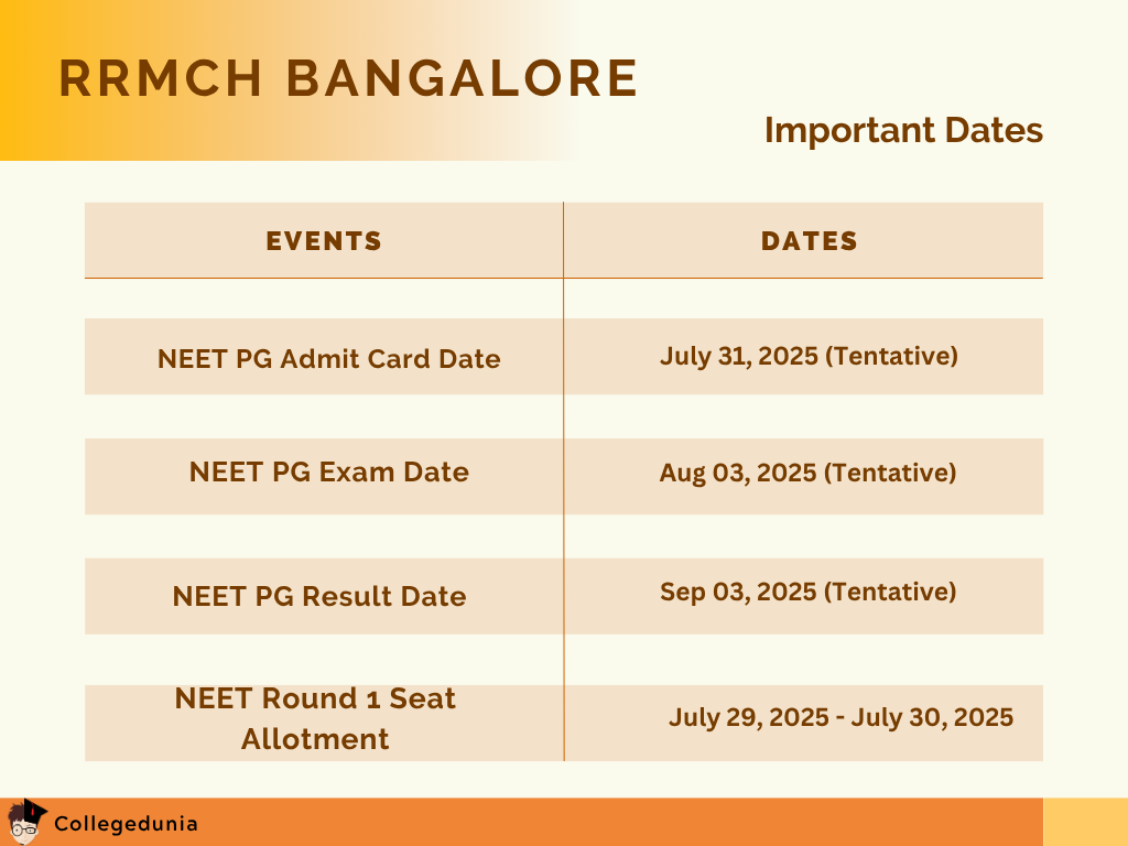 The registration, fee payment, and choice filling for MBBS program at RRMCH Round 1 counseling will be conducted from August 12 to August 20, 2025. Here are the Important dates for admission to the various programs at RRMCH.