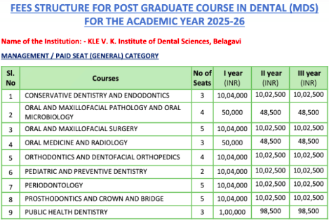 05 Aug, 2025 KLE VK Institute of Dental Sciences Belgaum has released MDS Oral & Maxillofacial Surgery Fee Structure 2025-2026. The total academic fee is ₹ 30.09 Lakhs.