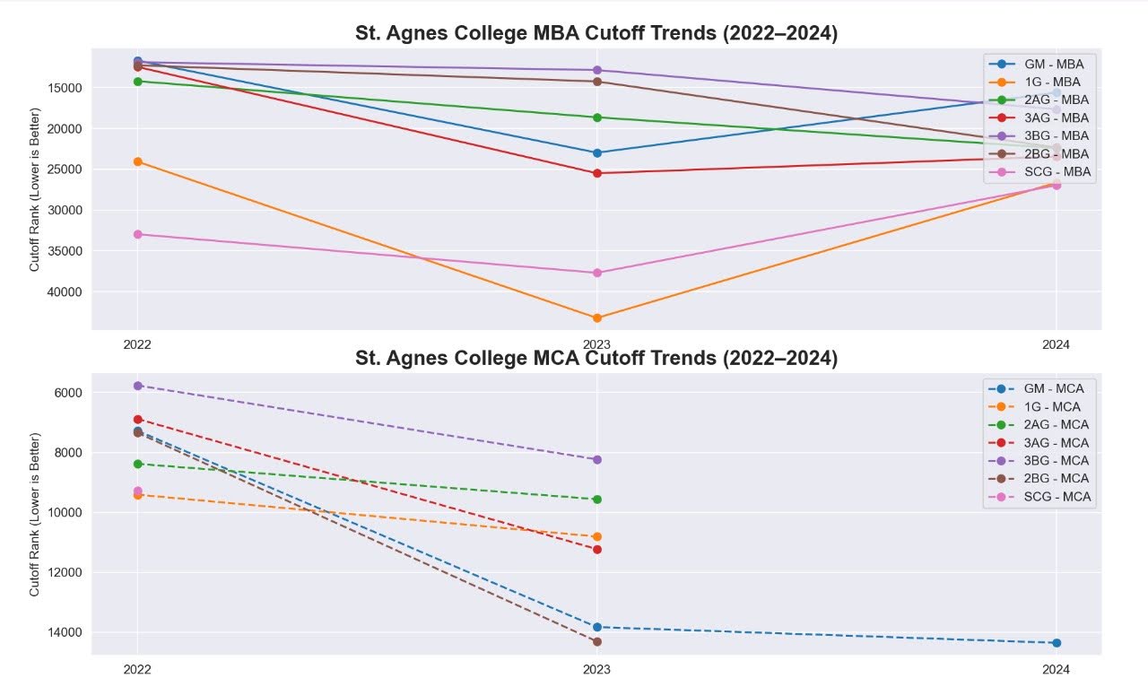 For the MBA program, the cutoffs improved for most categories, indicating higher competitiveness this year. However, a few categories like 2AG, 3BG, and 2BG saw a drop in performance, with cutoff ranks going higher than before.