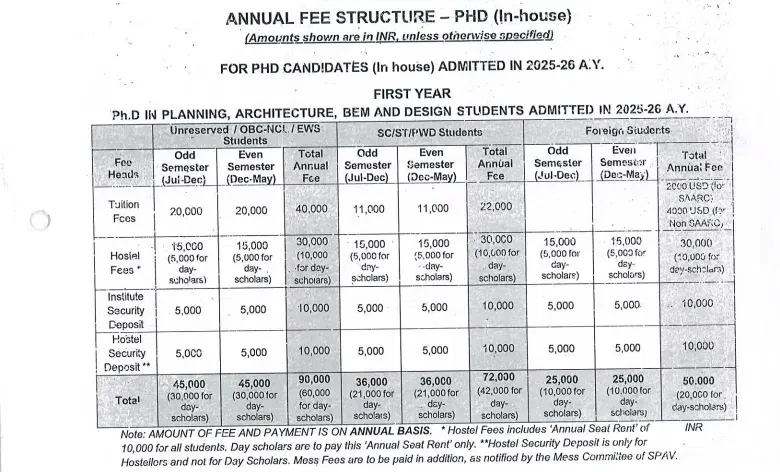 Comparing the course fees at these colleges, the total course fee at SPA Vijayawada is the highest with ₹ 3.35 Lakhs. This is followed by SPA Delhi with ₹ 1.12 Lakhs Among these, SPA Delhi has the lowest fee for Ph.D Architecture with ₹ 1.12 Lakhs.
