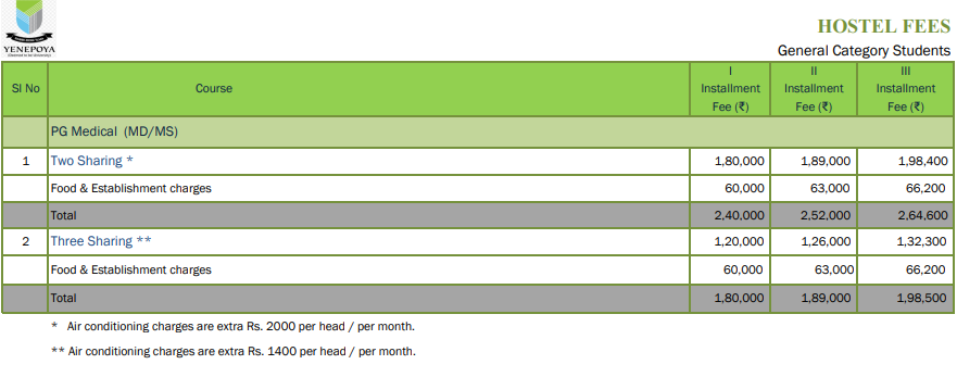 The hostel offers a variety of room sharing options, including 2, 3, 4, and 6-person accommodations, with attached or common bathrooms. There are both AC and non-AC rooms available, with AC rooms incurring additional electricity charges. Hostel fees vary by year, starting at 55,000 INR and increasing to 93,000 INR by the third year. Meals are included in the package, with 3 meals provided daily, including non-vegetarian options like chicken, egg, and fish multiple times a week.