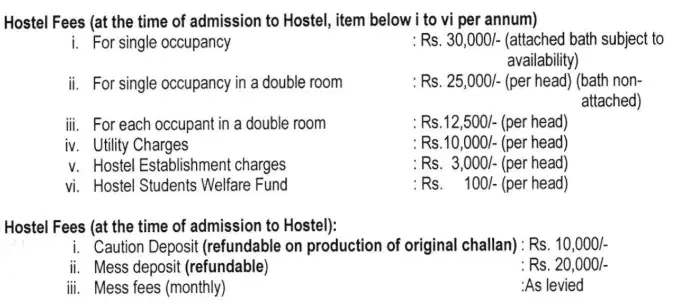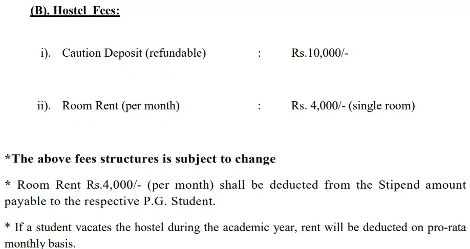 The hostel accommodates two students per room, with separate blocks for seniors and interns. Boys have two blocks, and girls have one block, with separate mess facilities for each gender. The campus includes four hostels: two for students and two for staff. Rooms are available in double or single occupancy, with no air conditioning.