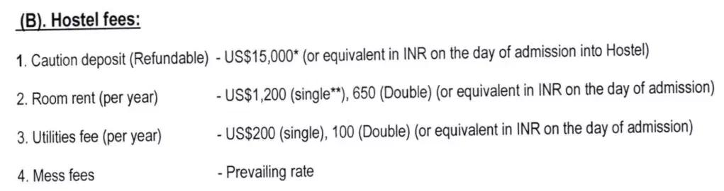 Facilities include daily cleaning, 24/7 access to hot and cold drinking water, a freezer, and a geyser for bathing. Each room is equipped with one bed, one fan, one study table, one balcony, and several lights. The meal quality is below average, primarily featuring South Indian cuisine, and requires filling a form for both hostel and mess registration.