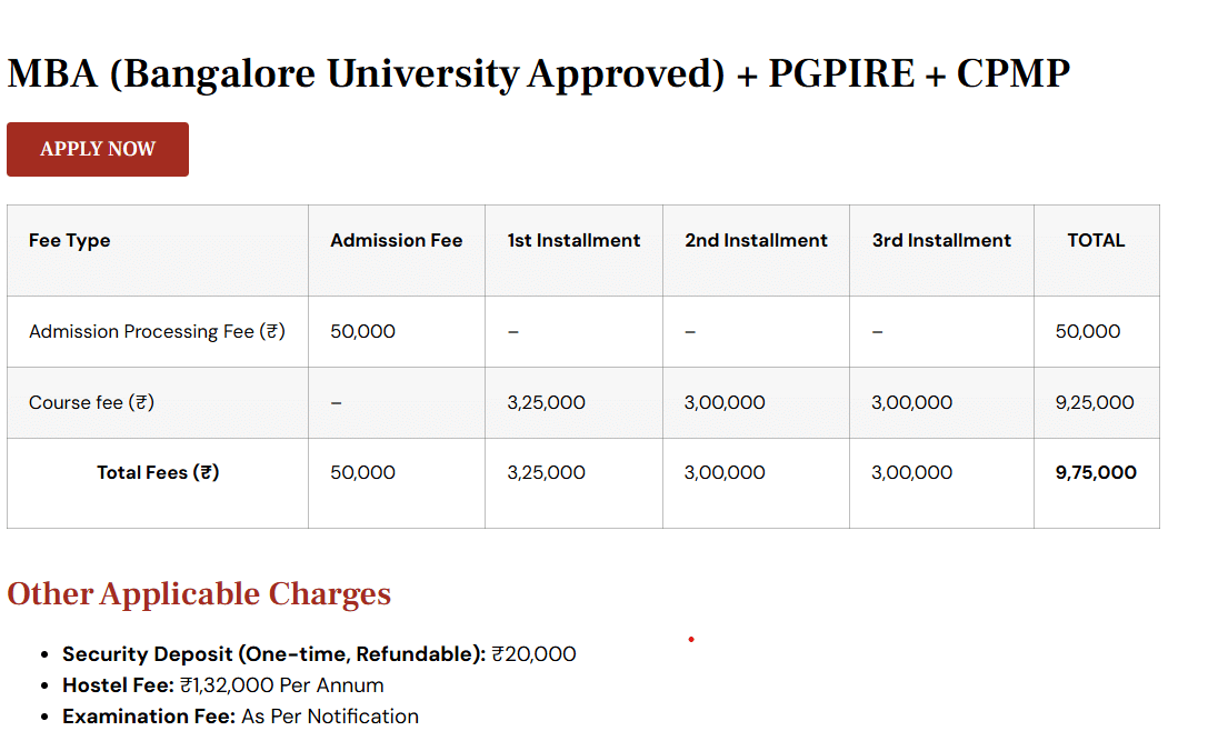 Earlier, MBA Marketing Management fees at GIBS Bangalore was ₹ 9.75 Lakhs (in 2025) for the entire course duration. This shows that the fee has remained unchanged since 2025.